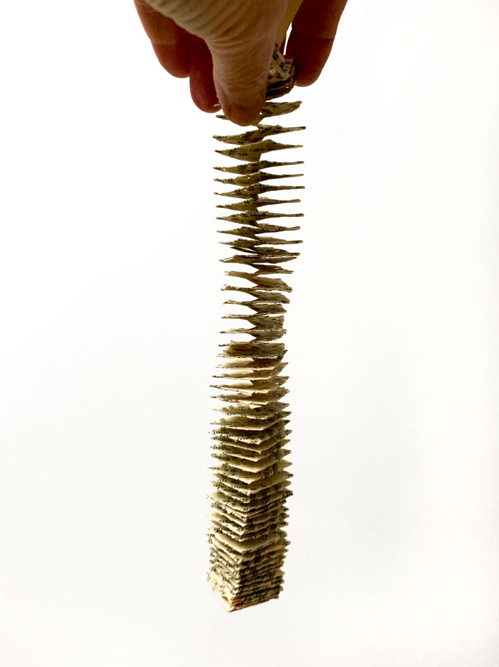 “Le moi retrouvé et encapsulé,” (spiral accordion book in round glass jar) (“The self re-found and encapsulated”), 2025, Handwoven, waxed book pages, 1.25 x 1.25 x 1.25 inches
