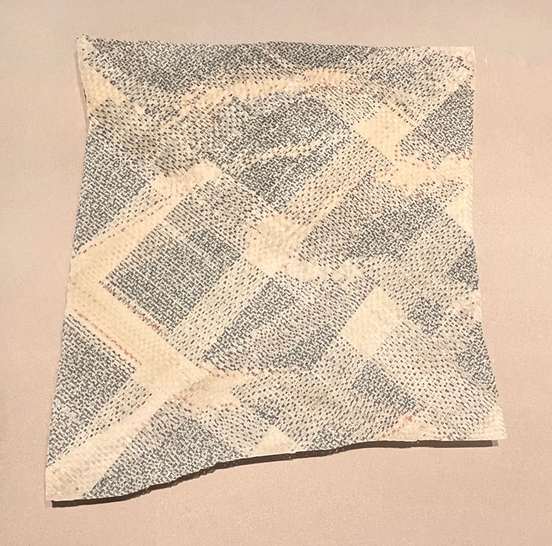 “The Unknowability of Language (large),” 2025, Handwoven, waxed book pages, 23 x 21 inches