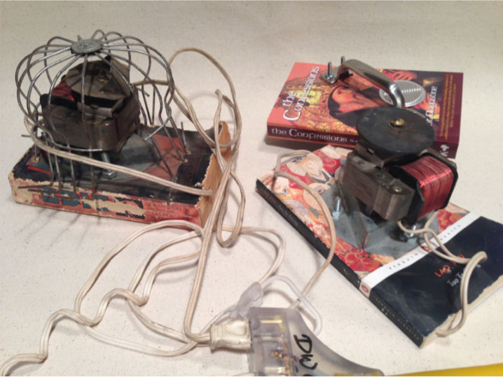 Right: “Motorized Tao Te Ching,” c.2013, found book, motor, electrical cord, hardware, 5 x 7.5 x 4 inches