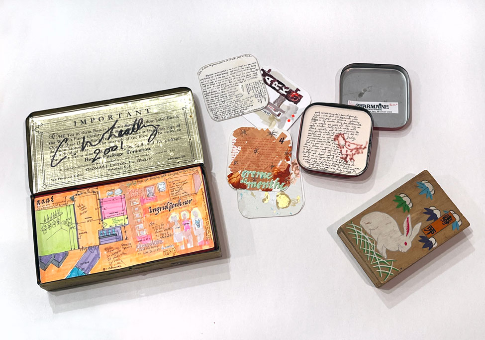 Left side: “Lipton,” 2001, nail varnish, color white out, 24K gold leaf, ink, graphite, on custom cut paper, 74 drawings, 2.75 x 5 inches each Right top: “Keelox,” 2000-01
