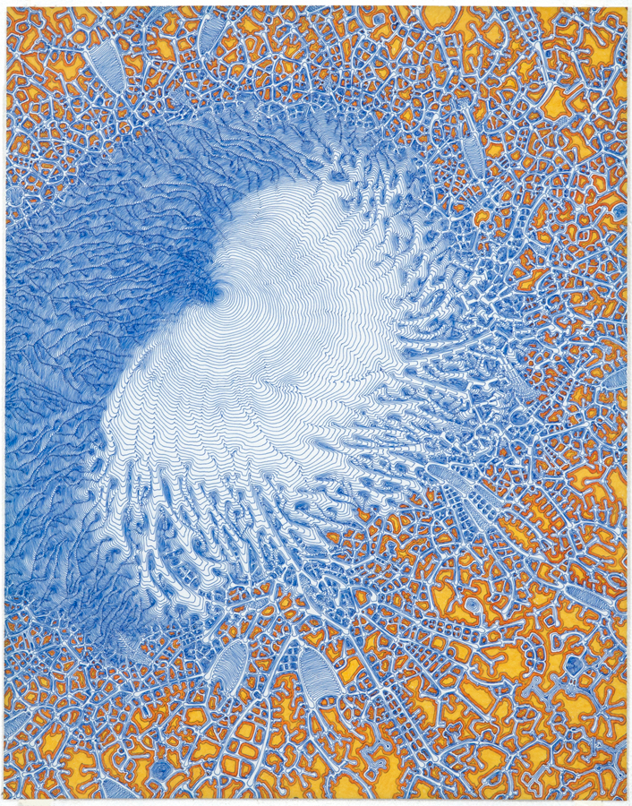 “Informal Relay,” 2021, Ink and acrylic on paper, 14 x 11 inches. Sold